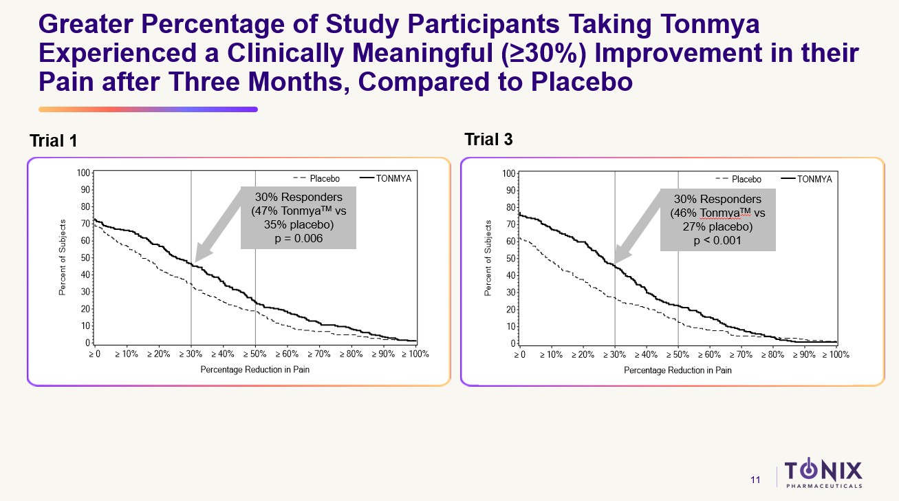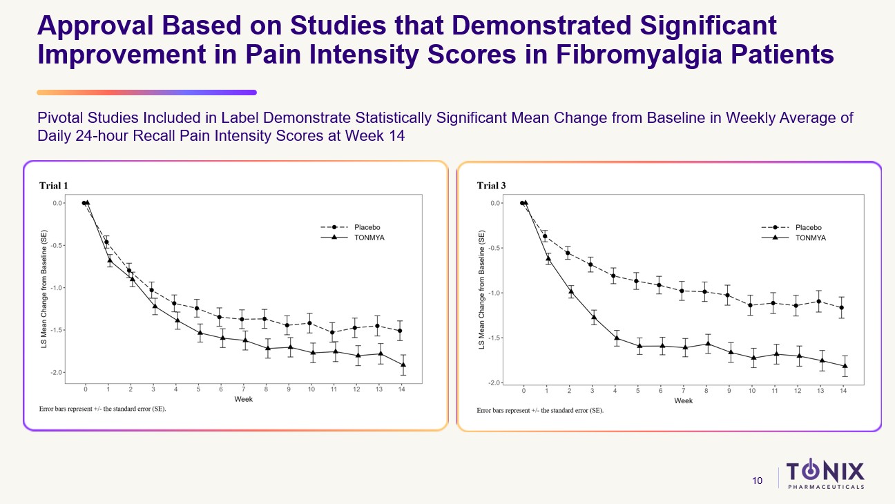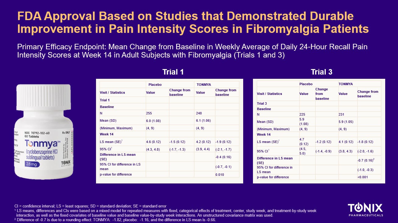 9 CI = confidence interval; LS = least squares; SD = standard deviation; SE = standard error 1 LS means, differences and CIs were based on a mixed model for repeated measures with fixed, categorical effects of treatment, c enter, study week, and treatment - by - study week interaction, as well as the fixed covariates of baseline value and baseline value - by - study week interactions. An unstructured co variance matrix was used. 2 Difference of - 0.7 is due to a rounding effect: TONMYA: - 1.82, placebo: - 1.16, and the difference in LS mean is - 0.66. FDA Approval Based on Studies that Demonstrated Durable Improvement in Pain Intensity Scores in Fibromyalgia Patients Primary Efficacy Endpoint: Mean Change from Baseline in Weekly Average of Daily 24 - Hour Recall Pain Intensity Scores at Week 14 in Adult Subjects with Fibromyalgia (Trials 1 and 3) TONMYA Placebo Change from baseline Value Change from baseline Value Visit / Statistics Trial 1 Baseline 248 255 N 6.1 (1.06) 6.0 (1.08) Mean (SD) (4, 9) (4, 9) (Minimum, Maximum) Week 14 - 1.9 (0.12) 4.2 (0.12) - 1.5 (0.12) 4.6 (0.12) LS mean (SE) 1 ( - 2.1, - 1.7) (3.9, 4.4) ( - 1.7, - 1.3) (4.3, 4.8) 95% CI 1 - 0.4 (0.16) Difference in LS mean (SE) ( - 0.7, - 0.1) 95% CI for difference in LS mean 0.010 p - value for difference TONMYA Placebo Change from baseline Value Change from baseline Value Visit / Statistics Trial 3 Baseline 231 225 N 5.9 (1.05) 5.9 (1.08) Mean (SD) (4, 9) (4, 9) (Minimum, Maximum) Week 14 - 1.8 (0.12) 4.1 (0.12) - 1.2 (0.12) 4.7 (0.12) LS mean (SE) 1 ( - 2.0, - 1.6) (3.8, 4.3) ( - 1.4, - 0.9) (4.5, 5.0) 95% CI 1 - 0.7 (0.16) 2 Difference in LS mean (SE) ( - 1.0, - 0.3) 95% CI for difference in LS mean <0.001 p - value for difference Trial 3 Trial 1