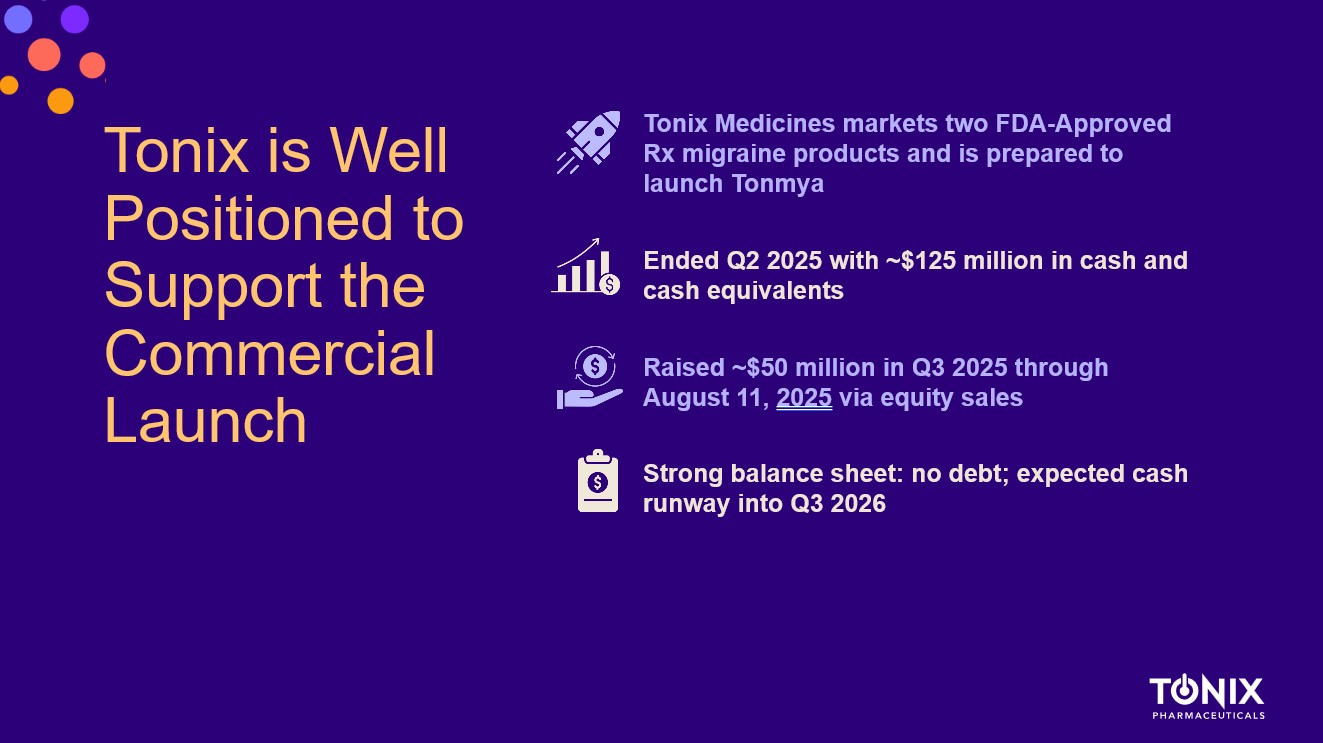 Tonmya TM is the First FDA - Approved Medicine for the Treatment of Fibromyalgia in Over 15 Years 5 1. Bhargava J, Goldin J. Fibromyalgia. [Updated 2025 Jan 31]. In: StatPearls [Internet]. Treasure Island (FL): StatPearls Publishing; 2025 Jan - . Available from: https://www.ncbi.nlm.nih.gov/books/NBK540974 2. U.S. Drug Enforcement Agency. Tonix is well positioned to support commercial launch, expected in Q4 2025 Commercial infrastructure in place No debt; anticipated cash runway to support launch and other operations into Q3 2026 Tonmya is a first - in - class medicine, uniquely designed to treat fibromyalgia Non - opioid analgesic. Not DEA 2 scheduled. Demonstrated rapid and durable improvement in chronic widespread pain Fibromyalgia: >10M people in the US living with this serious, debilitating condition Characterized by chronic widespread pain 1 Approximately 80% are female