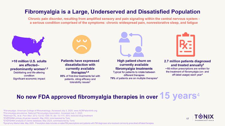 17 Fibromyalgia is a Large, Underserved and Dissatisfied Population 2.7 million patients diagnosed and treated annually 5 ~15 million prescriptions are written for the treatment of fibromyalgia (on - and off - label usage) each year 6 Patients have expressed dissatisfaction with currently available therapies 3,4 85% of first - line treatments fail with patients, citing efficacy and tolerability issues 4 High patient churn on currently available fibromyalgia treatments Typical for patients to rotate between different therapies 79% of patients are on multiple therapies 4 1 Fibromyalgia. American College of Rheumatology. Accessed July 3, 2025. www.ACRPatientInfo.org 2 Fibromyalgia prevalence. National Fibromyalgia Association. Accessed July 3, 2025. 3 Robinson RL, et al. Pain Med . 2012 13(10):1366 - 76. doi : 10.1111; 85% received drug treatment 4 EVERSANA primary physician research, May 2024; commissioned by Tonix 5 EVERSANA analysis of claims database, May 2024, commissioned by Tonix . 6 Symphony Market data, May 2025. Prescription data includes on - label FM prescriptions and patients with FM diagnoses who receive d commonly prescribed off - label therapies >10 million U.S. adults are affected – predominantly women 1,2 Debilitating and life - altering condition Significant economic impact No n ew FDA a pproved fibromyalgia therapies in over 15 years 4 Chronic pain disorder, resulting from amplified sensory and pain signaling within the central nervous system - a serious condition comprised of the symptoms: chronic widespread pain, nonrestorative sleep, and fatigue