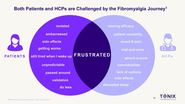 Both Patients and HCPs are Challenged by the Fibromyalgia Journey 1 18 1 Market research commissioned by Tonix, January 2025 PATIENTS HCPs FRUSTRATED isolated passed around do less validation unpredictable side effects embarrassed getting worse still tired when I wake up patient variability waning efficacy trial - and - error side effects comorbidities whack - a - mole mood & pain disrupted sleep lack of options