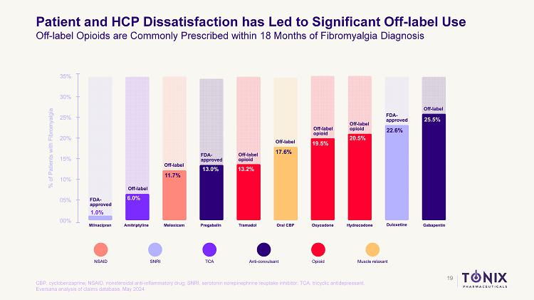Patient and HCP Dissatisfaction has Led to Significant Off - label Use Off - label Opioids are C ommonly P rescribed within 18 Months of Fibromyalgia Diagnosis CBP, cyclobenzaprine; NSAID, nonsteroidal anti - inflammatory drug; SNRI, serotonin norepinephrine reuptake inhibitor; TCA, tricyc lic antidepressant. Eversana analysis of claims database, May 2024. 19