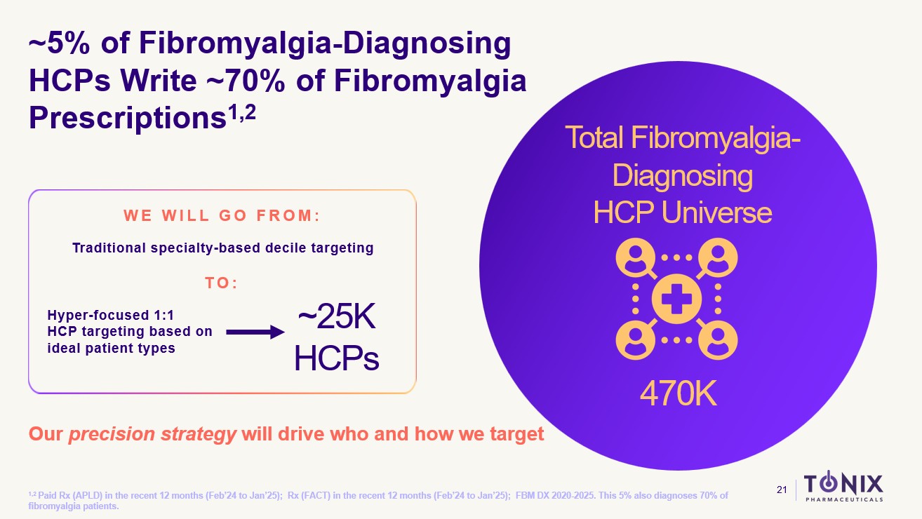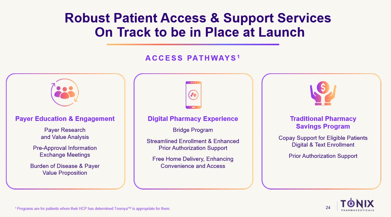 24 Payer Education & Engagement Payer Research and Value Analysis Pre - Approval Information Exchange Meetings Burden of Disease & Payer Value Proposition Traditional Pharmacy Savings Program Copay Support for Eligible Patients Digital & Text Enrollment Prior Authorization Support ACCESS PATHWAYS 1 1 Programs are for patients whom their HCP has determined Tonmya TM is appropriate for them. Robust Patient Access & Support Services On Track to be in Place at Launch Digital Pharmacy Experience Bridge Program Streamlined Enrollment & Enhanced Prior Authorization Support Free Home Delivery, Enhancing Convenience and Access