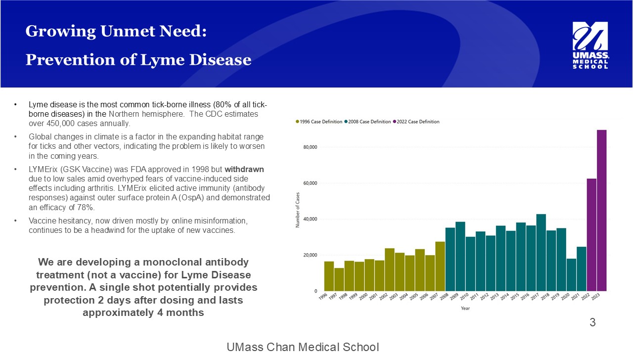 UMass Chan Medical School Growing Unmet Need: Prevention of Lyme Disease • Lyme disease is the most common tick - borne illness (80% of all tick - borne diseases) in the Northern hemisphere. The CDC estimates over 450,000 cases annually. • Global changes in climate is a factor in the expanding habitat range for ticks and other vectors, indicating the problem is likely to worsen in the coming years. • LYMErix (GSK Vaccine) was FDA approved in 1998 but withdrawn due to low sales amid overhyped fears of vaccine - induced side effects including arthritis. LYMErix elicited active immunity (antibody responses) against outer surface protein A ( OspA ) and demonstrated an efficacy of 78%. • Vaccine hesitancy, now driven mostly by online misinformation, continues to be a headwind for the uptake of new vaccines. We are developing a monoclonal antibody treatment (not a vaccine) for Lyme Disease prevention. A single shot potentially provides protection 2 days after dosing and lasts approximately 4 months 3