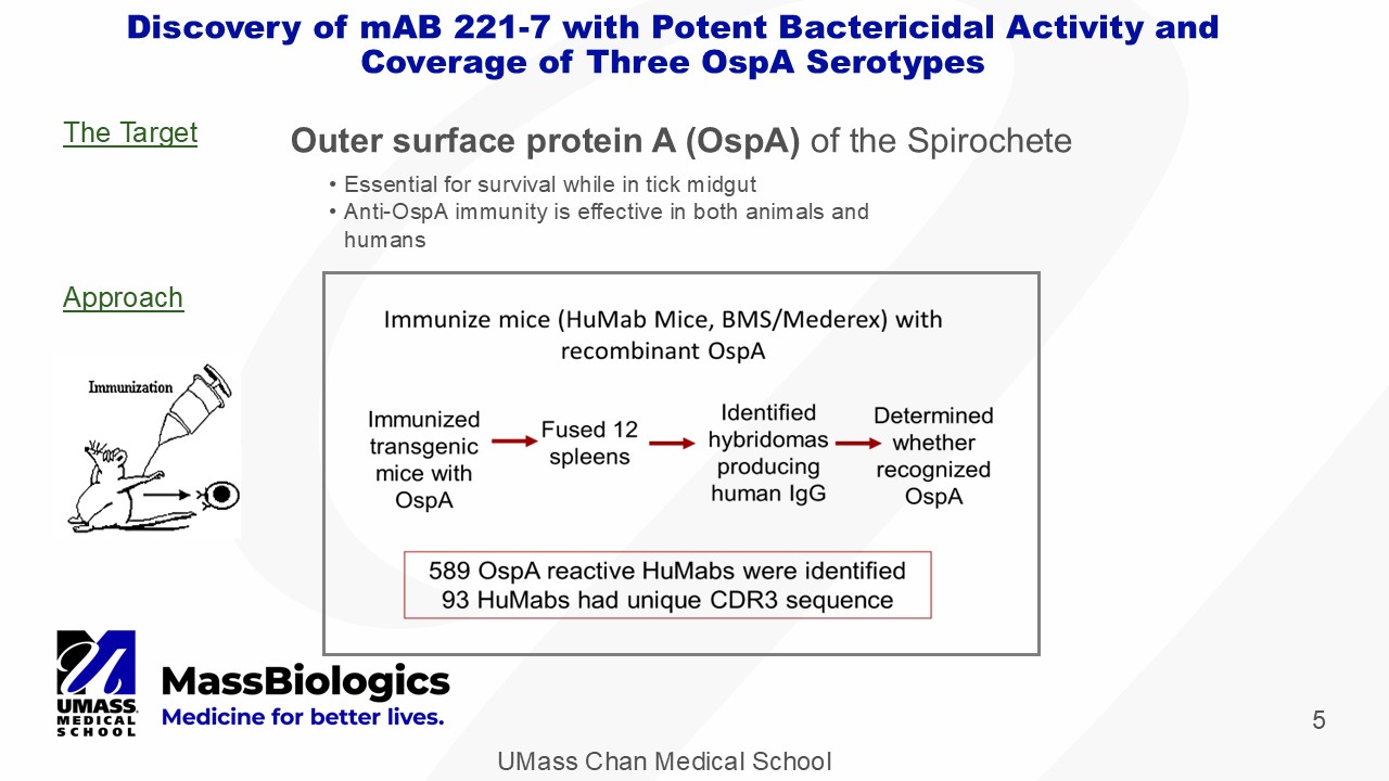 UMass Chan Medical School 5 Discovery of mAB 221 - 7 with Potent Bactericidal Activity and Coverage of Three OspA Serotypes • Essential for survival while in tick midgut • Anti - OspA immunity is effective in both animals and humans The Target Approach Outer surface protein A ( OspA ) of the Spirochete