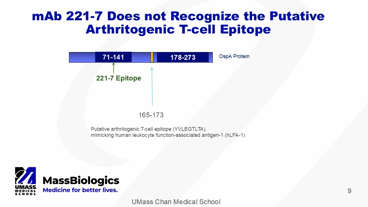 UMass Chan Medical School 9 mAb 221 - 7 Does not Recognize the Putative Arthritogenic T - cell Epitope OspA Protein 178 - 273 71 - 141 221 - 7 Epitope 165 - 173 Putative arthritogenic T - cell epitope (YVLEGTLTA), mimicking human leukocyte function - associated antigen - 1 (hLFA - 1) 178 - 273
