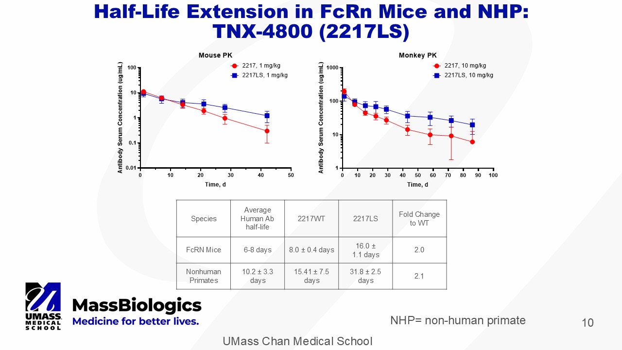 UMass Chan Medical School 10 Fold Change to WT 2217LS 2217WT Average Human Ab half - life Species 2.0 16.0 ± 1.1 days 8.0 ± 0.4 days 6 - 8 days FcRN Mice 2.1 31.8 ± 2.5 days 15.41 ± 7.5 days 10.2 ± 3.3 days Nonhuman Primates Half - Life Extension in FcRn Mice and NHP: TNX - 4800 (2217LS) NHP= non - human primate
