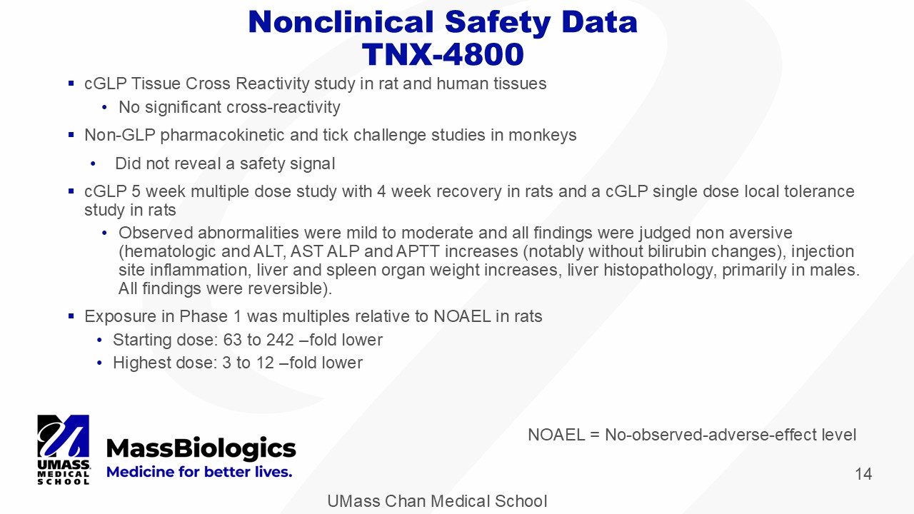 UMass Chan Medical School 13 Minimum Effective Concentration (MEC) TNX - 4800 (2217 - LS) • ~ 5 μ g/mL – in vitro bactericidal activity • TNX - 4800 showed EC 50 ≈ 0.56 μ g/mL in vitro 1 • MEC ~ 10X EC 50 • <10 μ g/mL – in vitro tick feeding experiment • TNX - 4800 showed bactericidal activity ≥10 μ g/ml • <21 μ g/mL – in vivo primate challenge models 1,2 • TNX - 4800 serum levels >21 μ g/ml were 95% protective 1 Wang Y, et al. J Infect Dis. 2016 Jul 15;214(2):205 - 11. 2 Schiller ZA, et al. J Clin Invest . 2021;131(11):e144843.