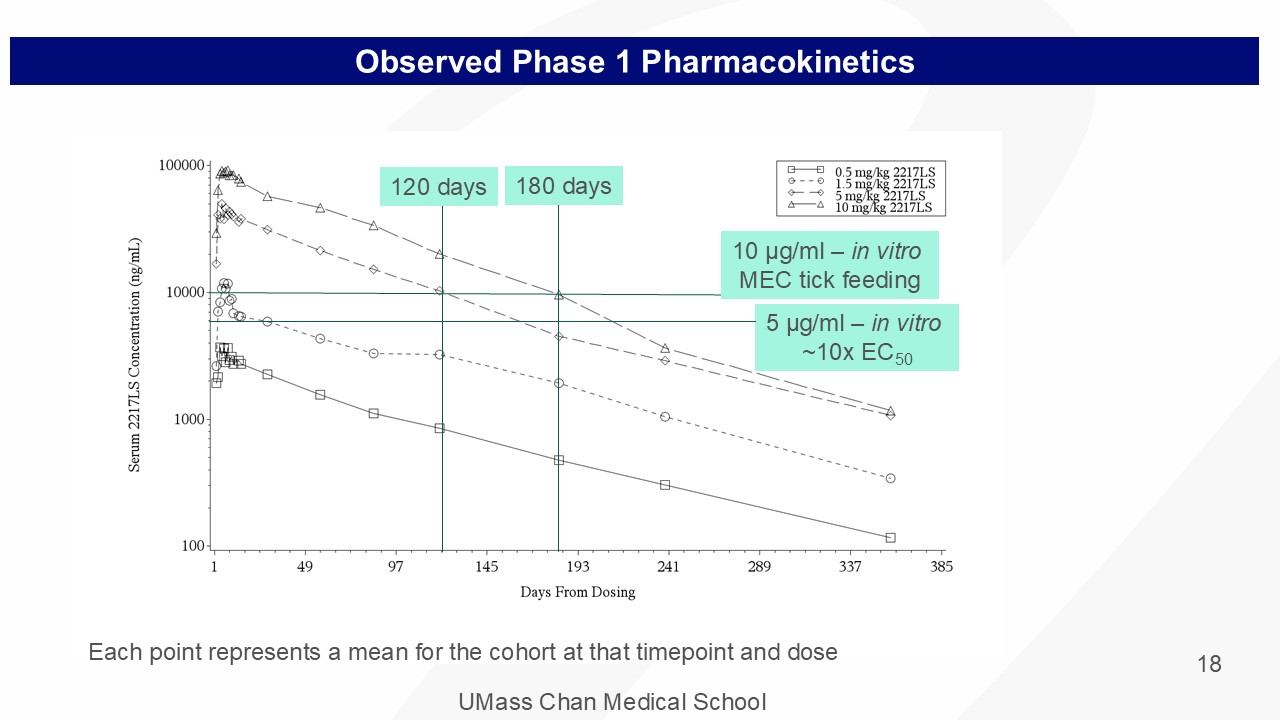 UMass Chan Medical School 18 Observed Phase 1 Pharmacokinetics 5 μ g/ml – in vitro ~10x EC 50 10 μ g/ml – in vitro MEC tick feeding 120 days 180 days Each point represents a mean for the cohort at that timepoint and dose