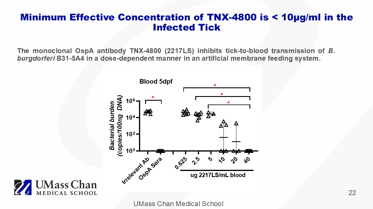 UMass Chan Medical School 22 The monoclonal OspA antibody TNX - 4800 ( 2217 LS) inhibits tick - to - blood transmission of B . burgdorferi B 31 - 5 A 4 in a dose - dependent manner in an artificial membrane feeding system . Minimum Effective Concentration of TNX - 4800 is < 10 μ g/ml in the Infected Tick I r r e l e v a n t A b O s p A S e r a 0 . 6 2 5 2 . 5 5 1 0 2 0 4 0 10 0 10 2 10 4 10 6 B a c t e r i a l b u r d e n ( c o p i e s / 1 0 0 n g D N A ) * * * * ug 2217LS/mL blood Blood 5dpf