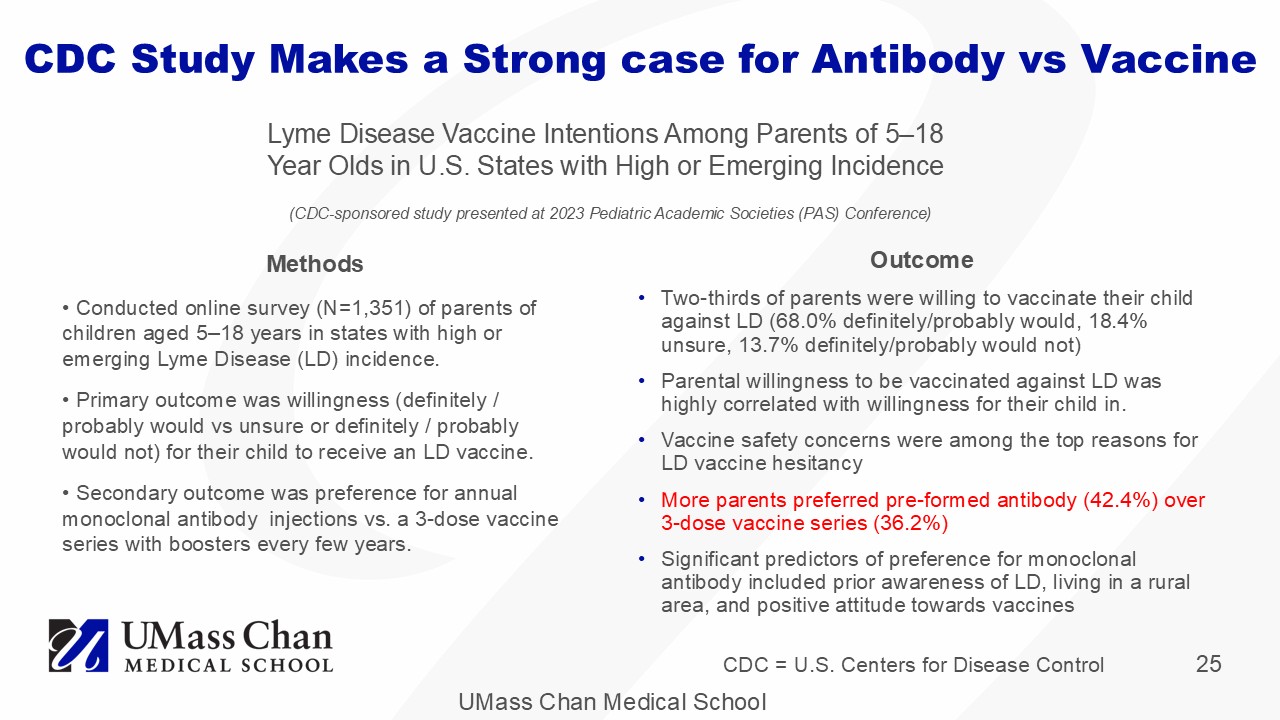 UMass Chan Medical School 25 Outcome • Two - thirds of parents were willing to vaccinate their child against LD (68.0% definitely/probably would, 18.4% unsure, 13.7% definitely/probably would not) • Parental willingness to be vaccinated against LD was highly correlated with willingness for their child in. • Vaccine safety concerns were among the top reasons for LD vaccine hesitancy • More parents preferred pre - formed antibody (42.4%) over 3 - dose vaccine series (36.2%) • Significant predictors of preference for monoclonal antibody included prior awareness of LD, living in a rural area, and positive attitude towards vaccines CDC Study Makes a Strong case for Antibody vs Vaccine Methods • Conducted online survey (N=1,351) of parents of children aged 5 – 18 years in states with high or emerging Lyme Disease (LD) incidence. • Primary outcome was willingness (definitely / probably would vs unsure or definitely / probably would not) for their child to receive an LD vaccine. • Secondary outcome was preference for annual monoclonal antibody injections vs. a 3 - dose vaccine series with boosters every few years. Lyme Disease Vaccine Intentions Among Parents of 5 – 18 Year Olds in U.S. States with High or Emerging Incidence (CDC - sponsored study presented at 2023 Pediatric Academic Societies (PAS) Conference) CDC = U.S. Centers for Disease Control